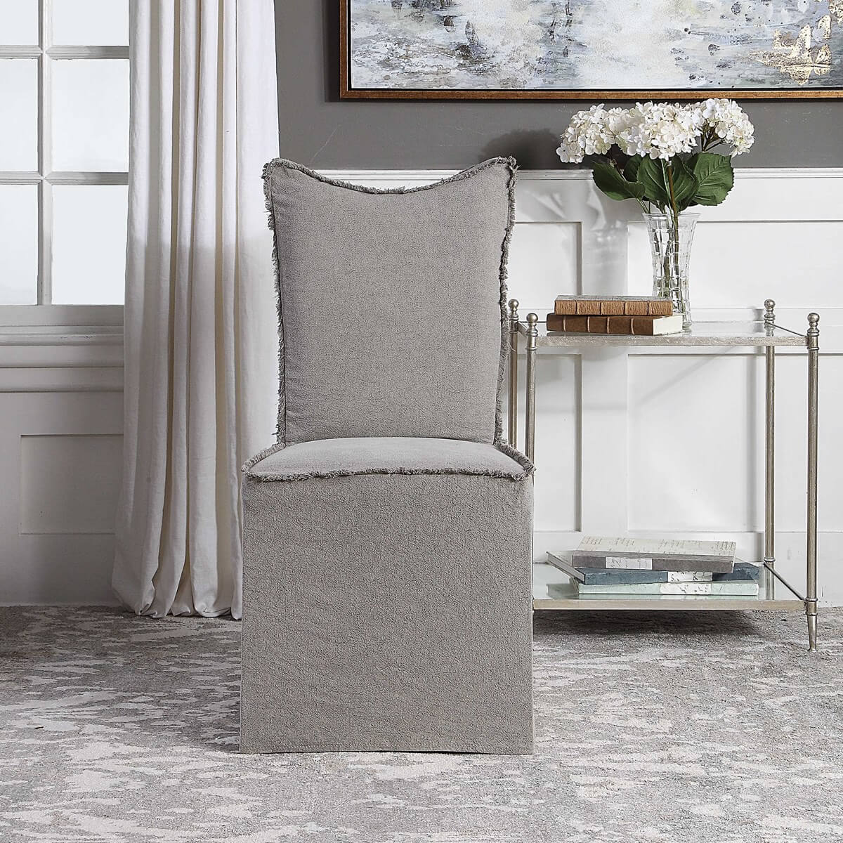 Stonewashed gray linen blend slipcover features a reverse seam with fringe, draped over an armless frame with naturally finished poplar legs, body fabric is a neutral linen. Slipcovers packaged separately. Seat height is 19″. Packed 2 per box but priced individually. Must be purchased in increments of 2.